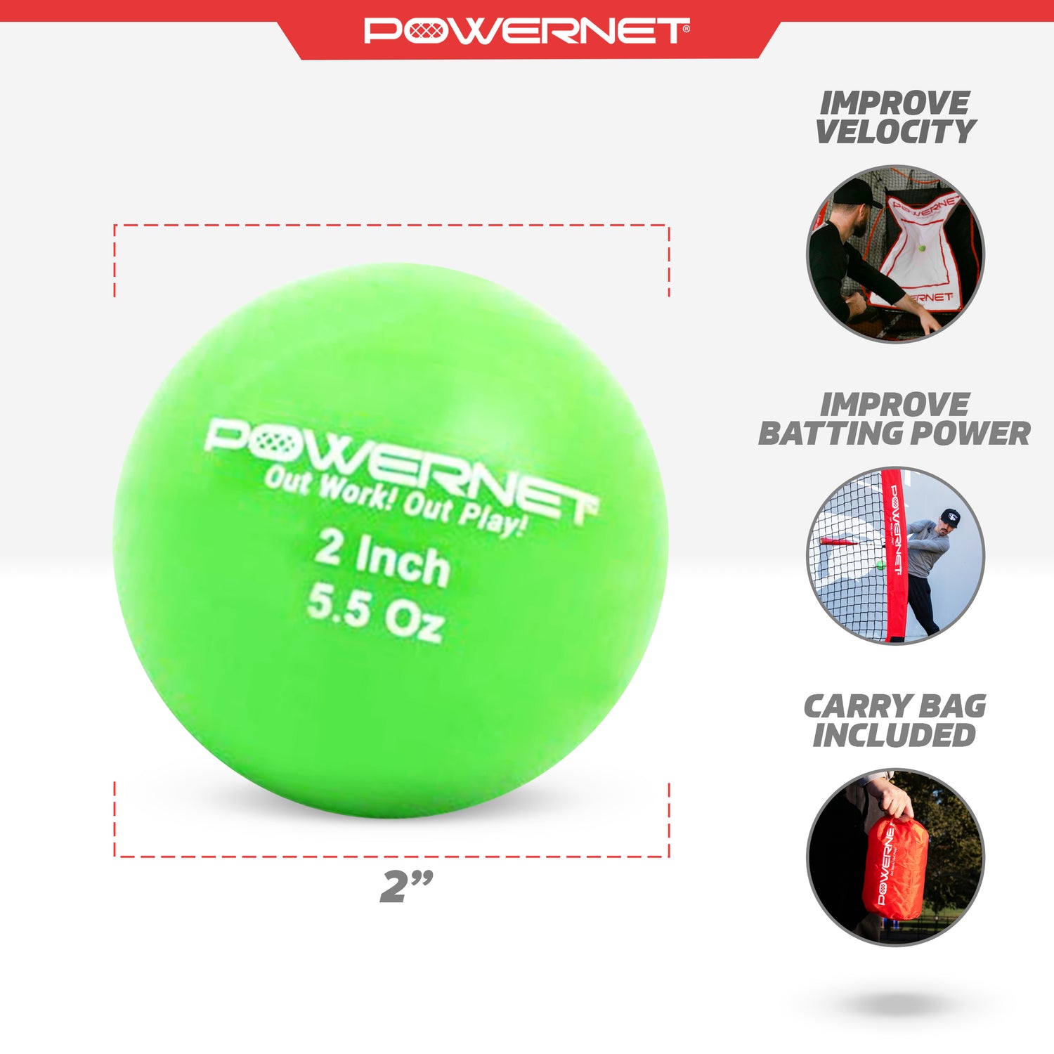 - 3.5 OZ | 5.5 OZ WEIGHTED BALLS: PowerNet's 2-inch micro weighted training balls help refine batting and throwing techniques. Choose the desired weight for targeted and customized training (3.5 oz or 5.5 oz). Includes 6 balls and a carry bag