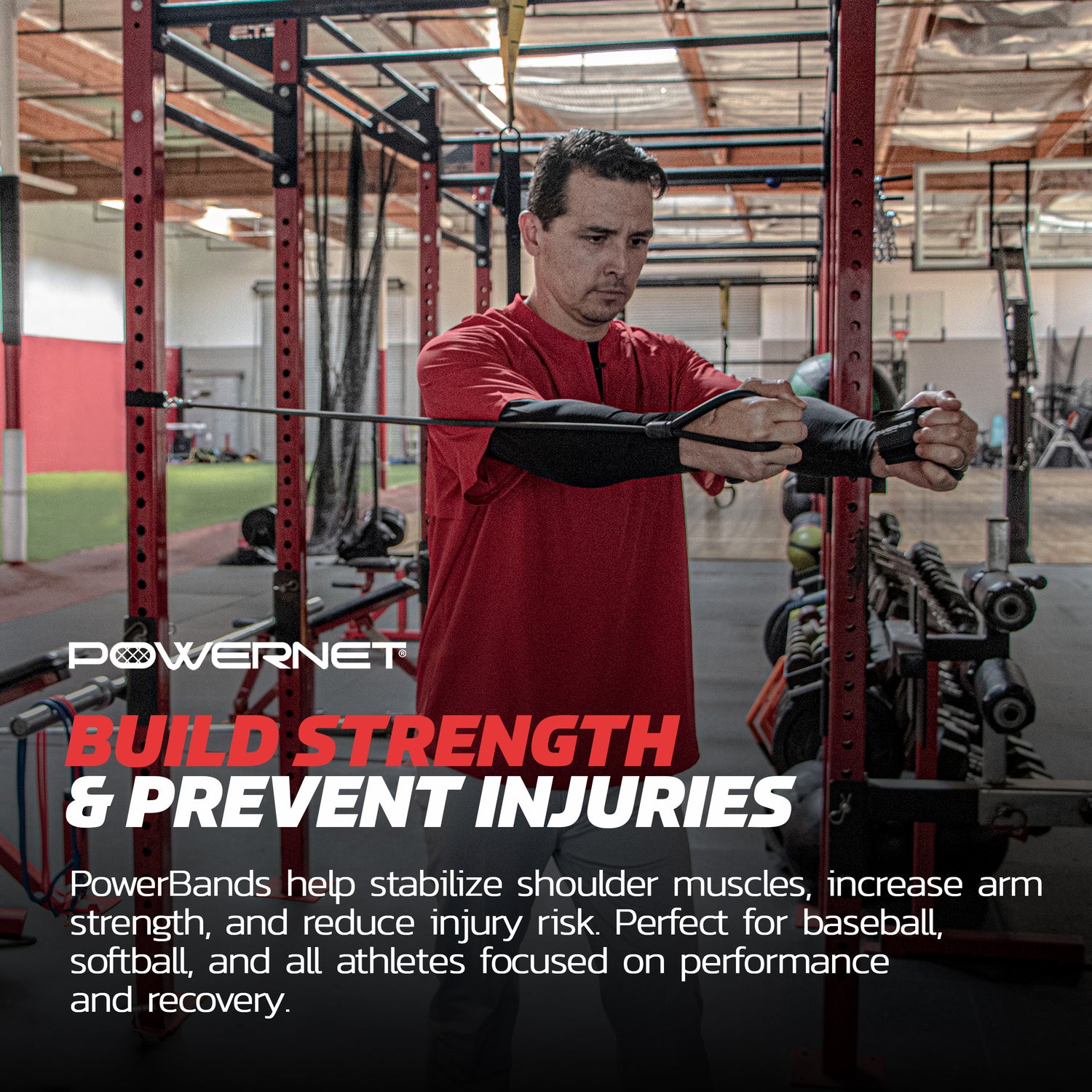 - HELPS INJURY PREVENTION: PowerBands can be used during warm-up or cool-downs. The arm bands are effective in helping prevent injuries and are useful during rehab. Do not wait for an injury to start taking care of your shoulders and arms
