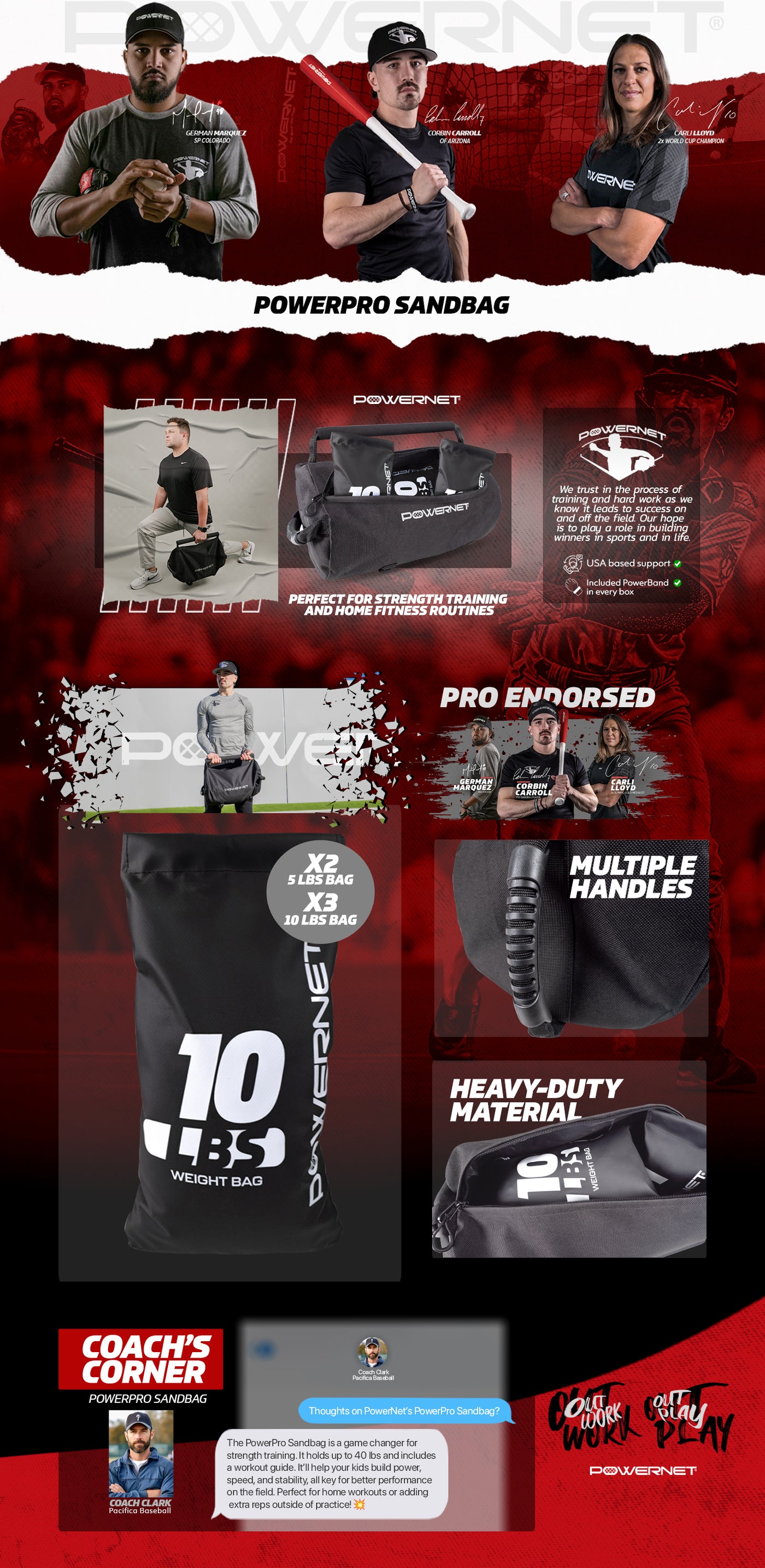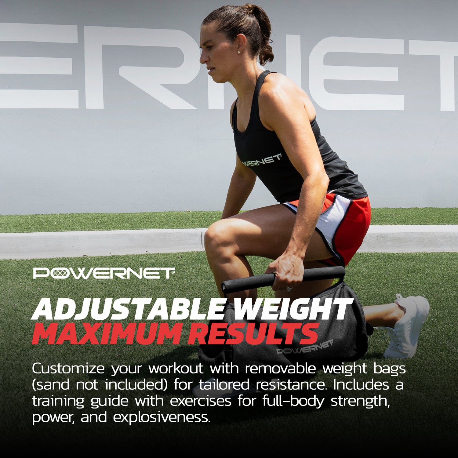 - POWERPRO SANDBAG: This heavy-duty, durable workout equipment is perfect for strength training and home fitness routines. The PowerPro Sandbag is designed to hold up to 40 pounds. It is ideal for improving power, strength, explosiveness, and durability