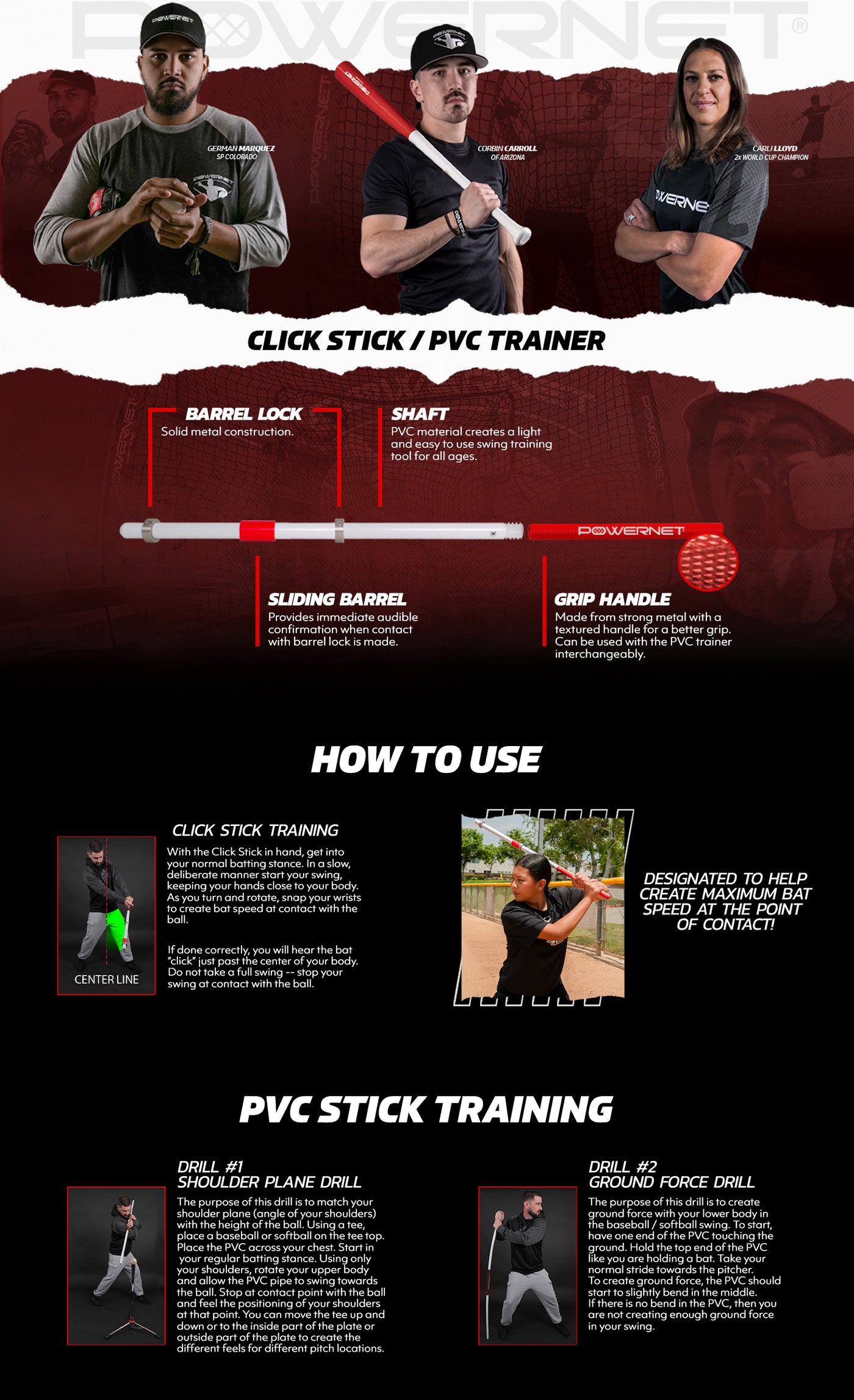 - TRAIN SOLO OR WITH TEAM: Carry the training PVC Click Stick combo trainer in your backpack to train whenever. Add this baseball gear to the team equipment to improve hitting and stance. The stick is designed to help create maximum bat speed at the point of contact with the baseball or softball by providing audible confirmation