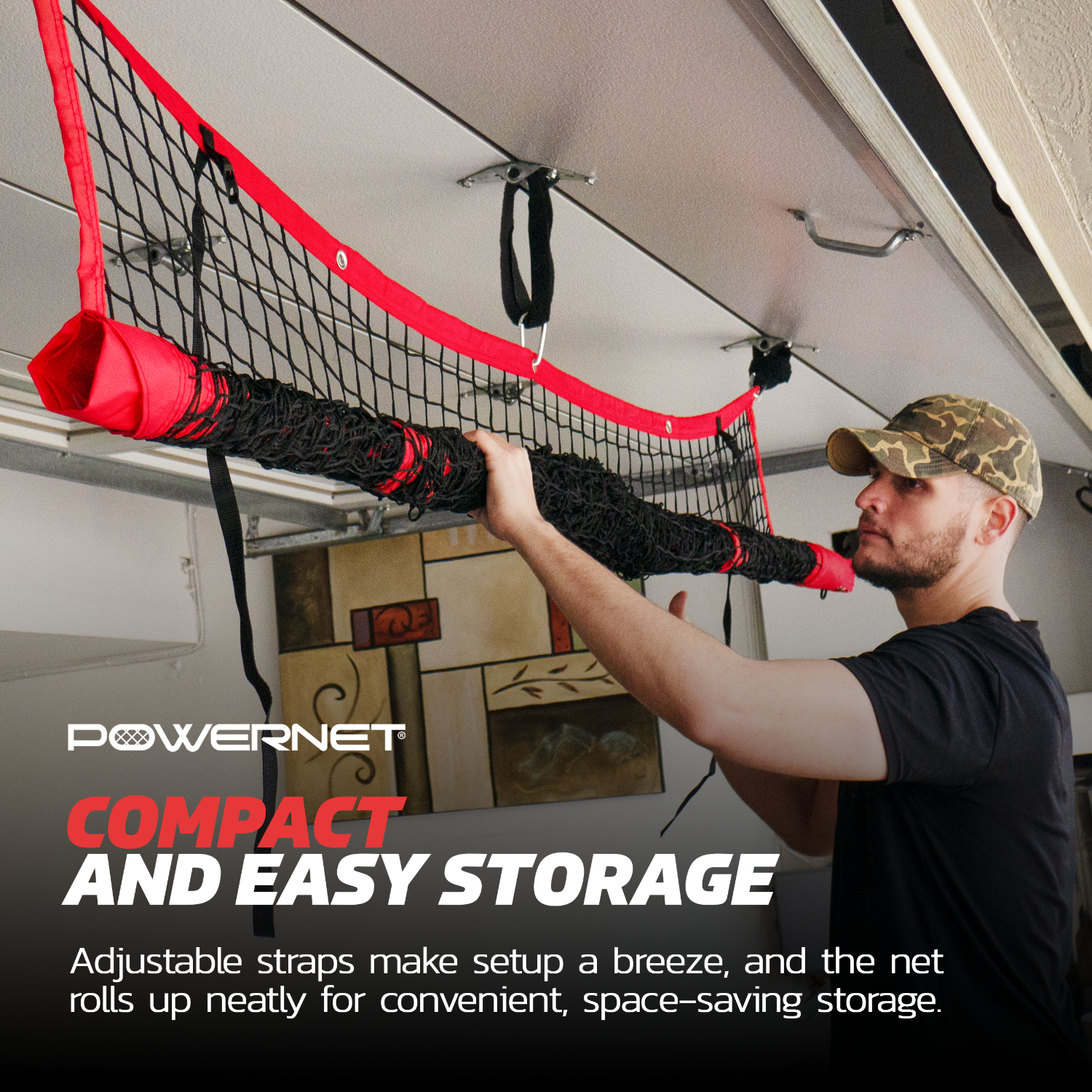 - QUICK SETUP AND EASY STORAGE: Adjustable straps make it simple to attach the pitching net to most garage doors or other open spaces, transforming your garage into a dedicated practice area. When finished, the net rolls up neatly, offering a compact and convenient storage solution that keeps your space clutter-free
