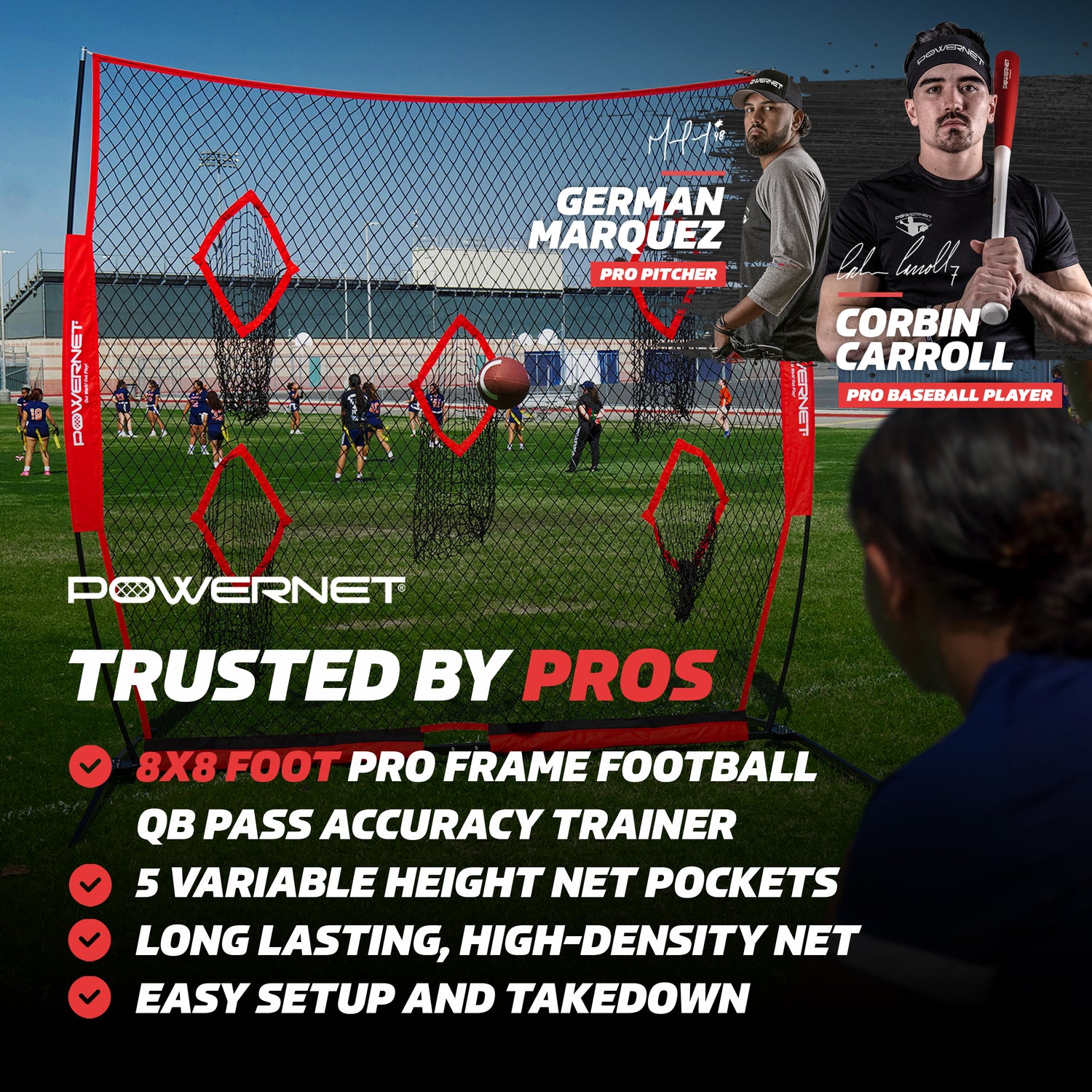 - 8 BY 8 FT FOOTBALL QB PASS ACCURACY TRAINER: PowerNet's Quarterback passing trainer is designed for throwing drills to help increase pass accuracy. The 8x8 FT football net covers 64 square feet, providing a large target area for practicing passes to improve accuracy and skill