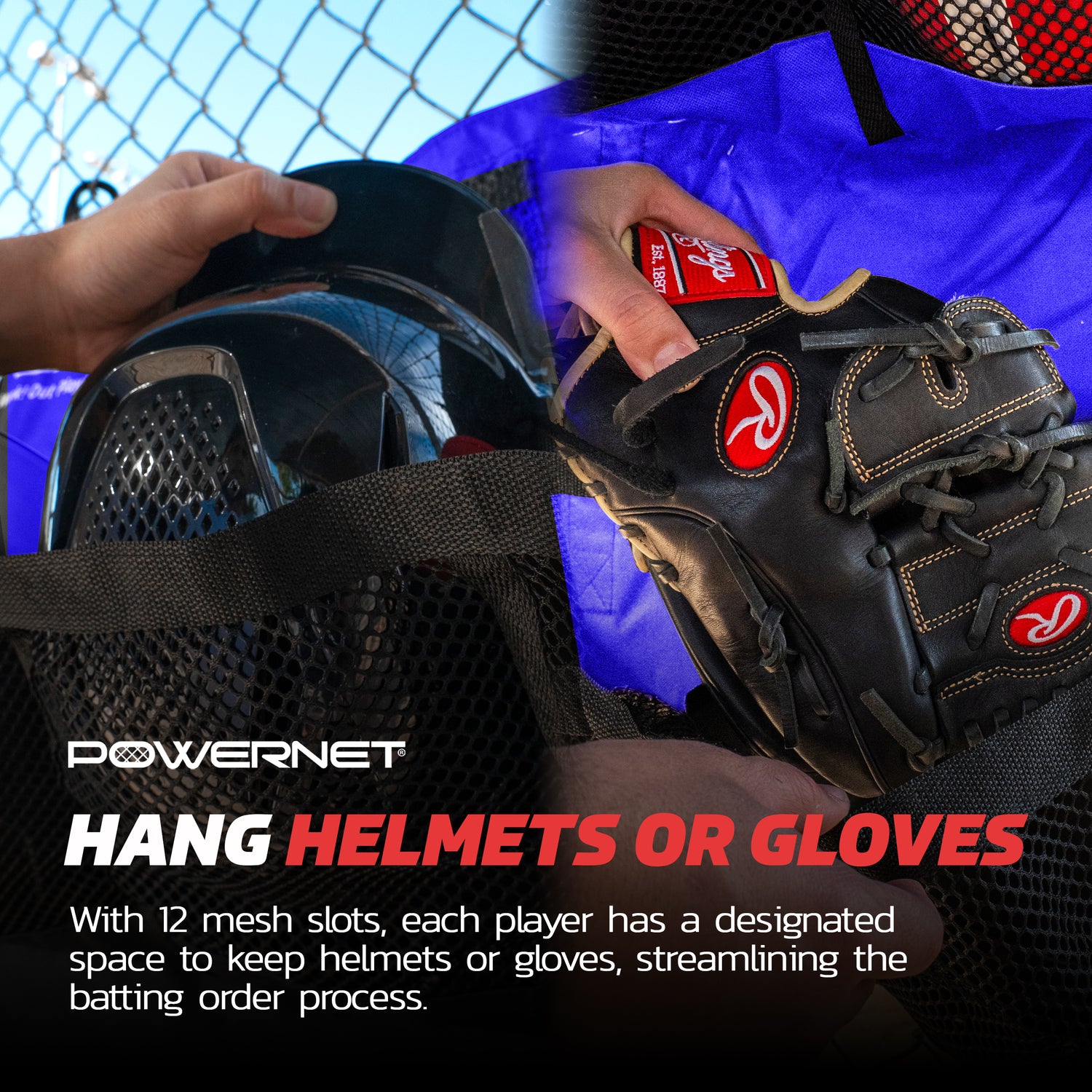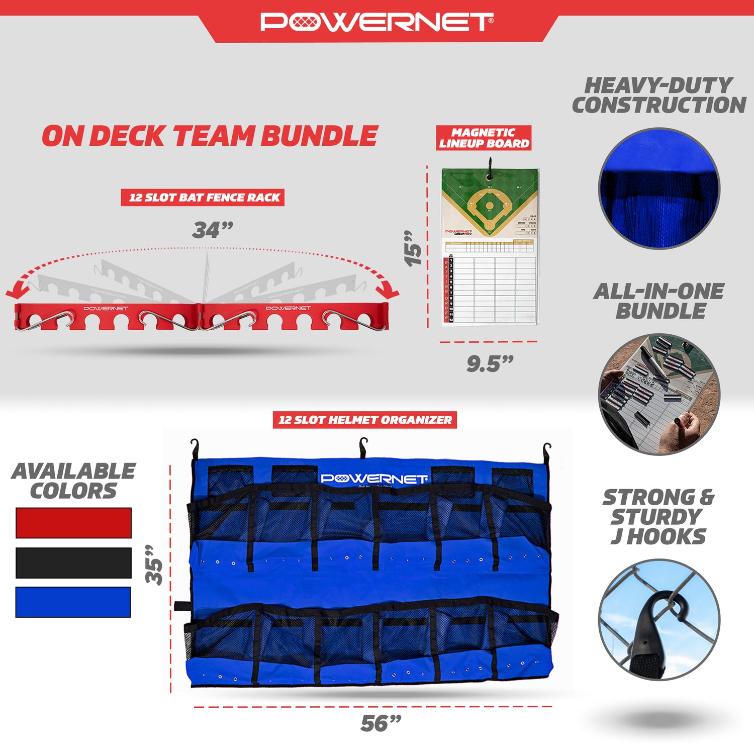 - BLUE DUGOUT ORGANIZER: The PowerNet On Deck Team Bundle for Baseball & Softball provides ultimate organization for your team’s baseball and softball gear on game day. The bundle includes a hanging helmet organizer, a bat fence rack and PowerNet Lineup Pro