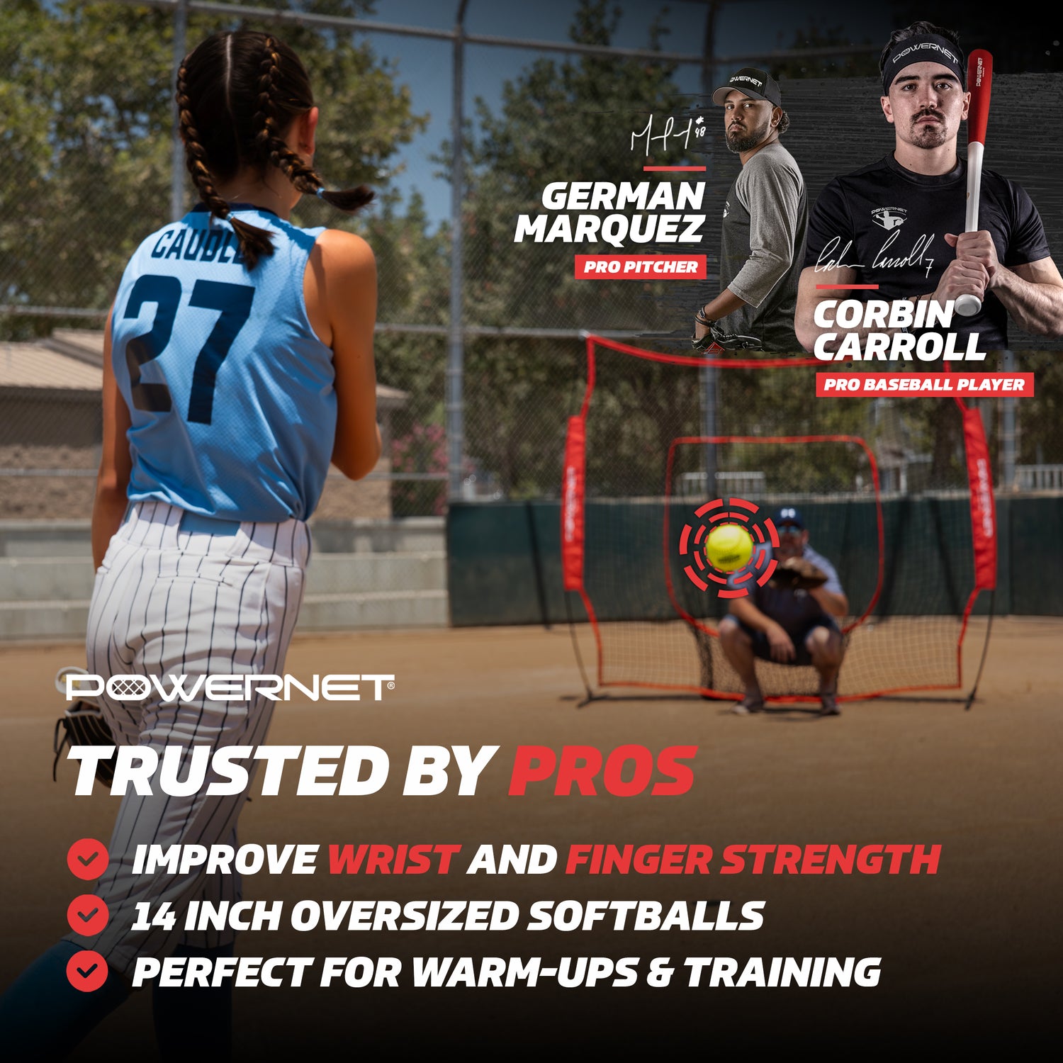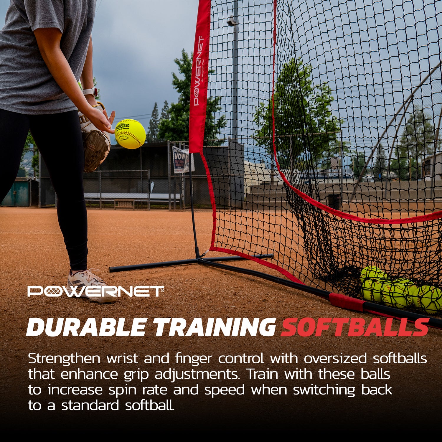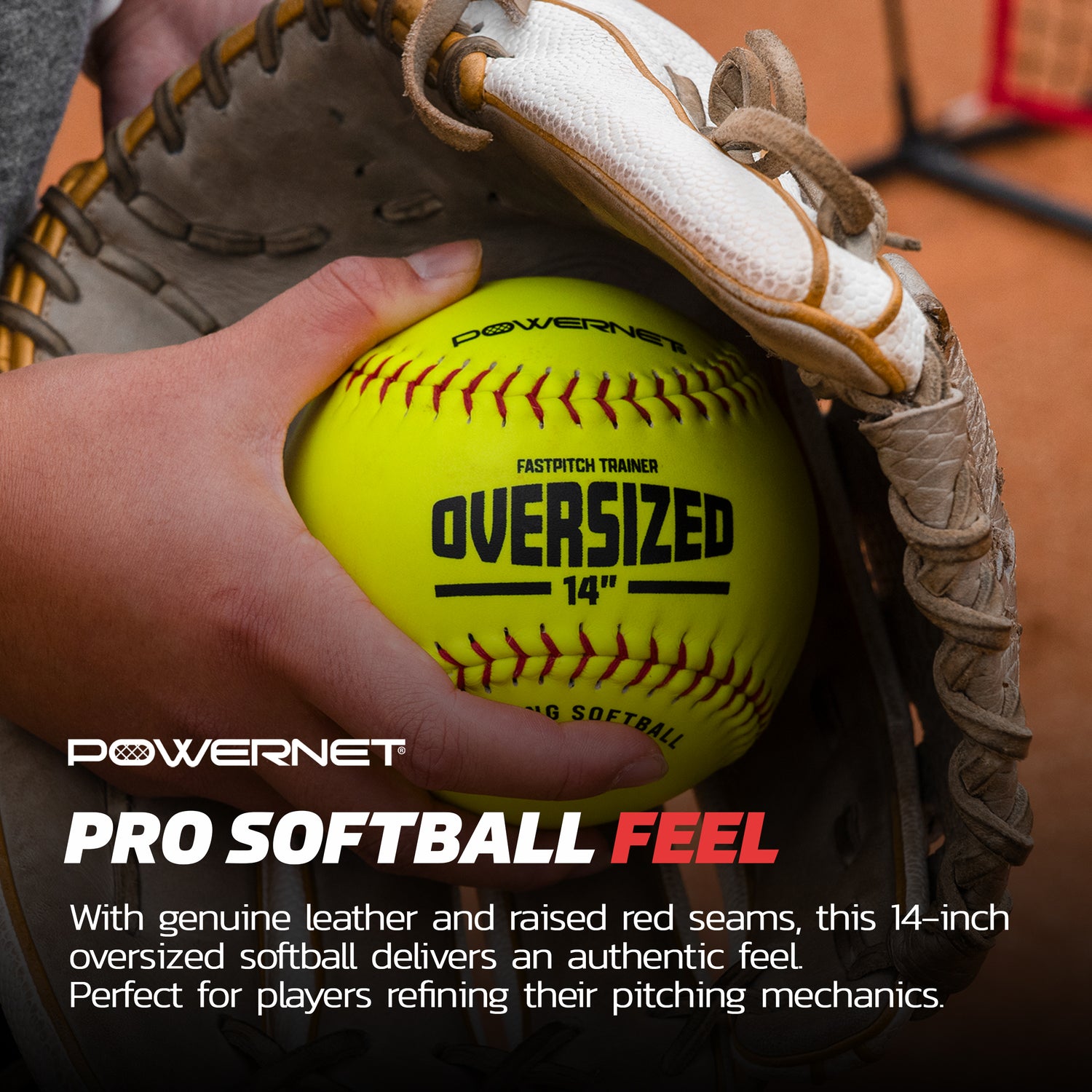 - 14 INCH OVERSIZED SOFTBALLS: The larger-sized ball challenges the pitcher to throw the Oversized Softball with proper mechanics & encourages growth.to work on their grips. Includes three 14-inch softballs