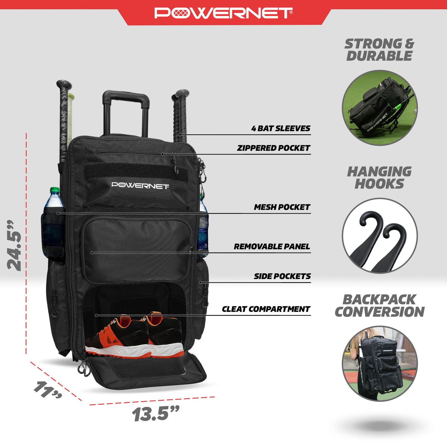 The PowerNet Odyssey Rolling Bag—gear up and roll in style! With tons of space, easy hooks, and smooth wheels, it’s your game-day must-have!